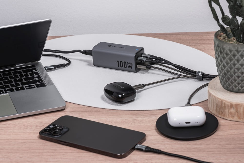Ładowarka biurkowa do smartfonów, tabletów i laptopów, wykonana w innowacyjnej technologii GaN III. Jest kompaktowa i energooszczędna, a dzięki czterem portom pozwala ładować do czterech urządzeń jednocześnie. Ładowarka obsługuje standardy ładowania Quick Charge™ 4.0*, Power Delivery i Super Fast Charging 2.0. Łączna moc wynosi 100 W.
