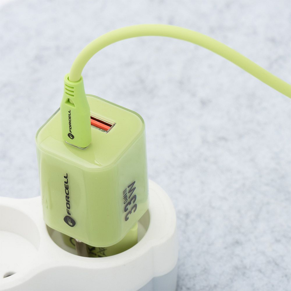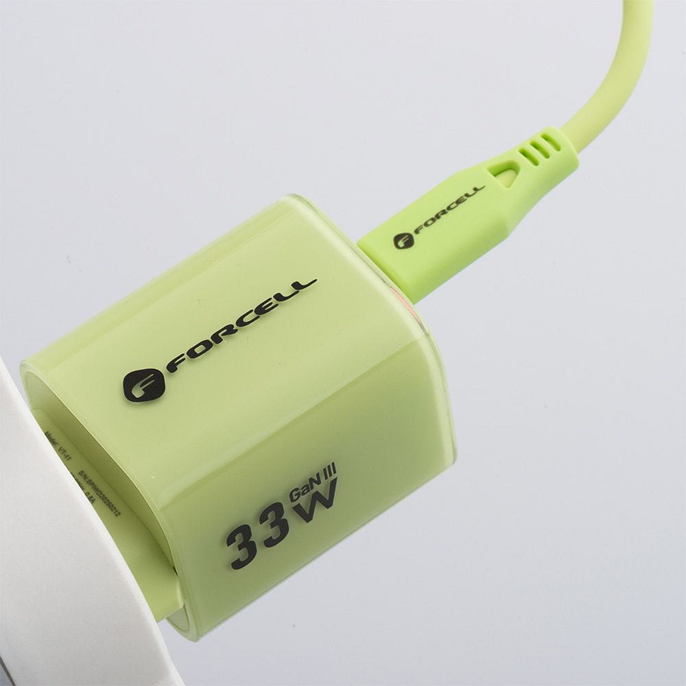 Szybka ładowarka do telefonu Forcell F-Energy z silikonowym kablem Crystal Color GaN III VT-41 1 x Typ C + 1 x USB A PD QC4.0 33W zielona