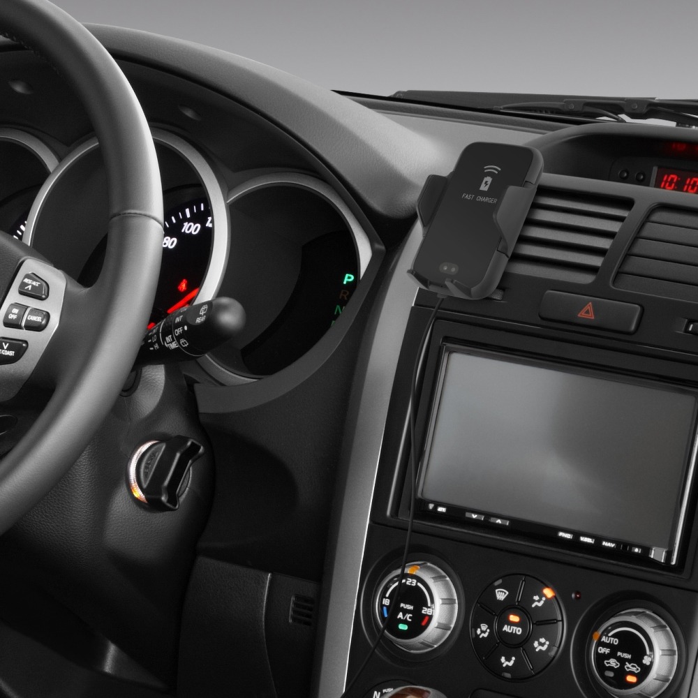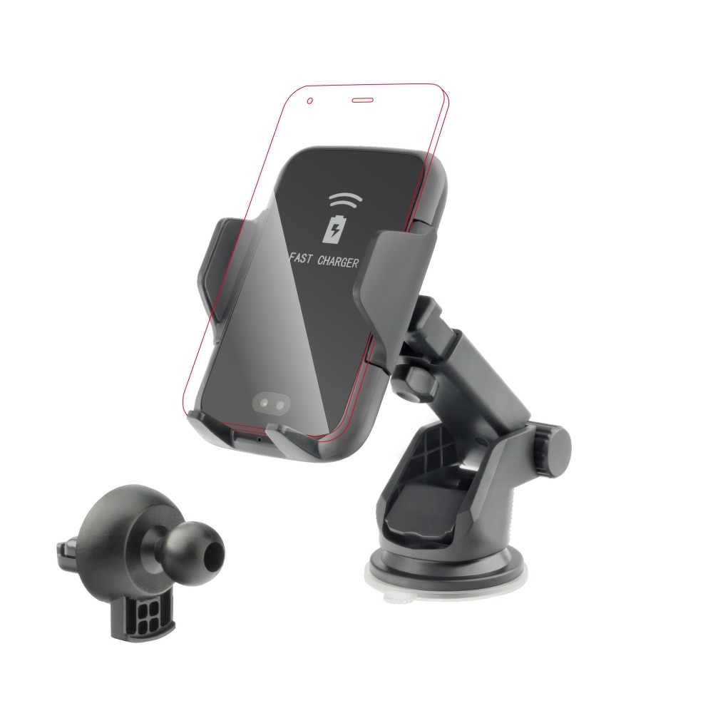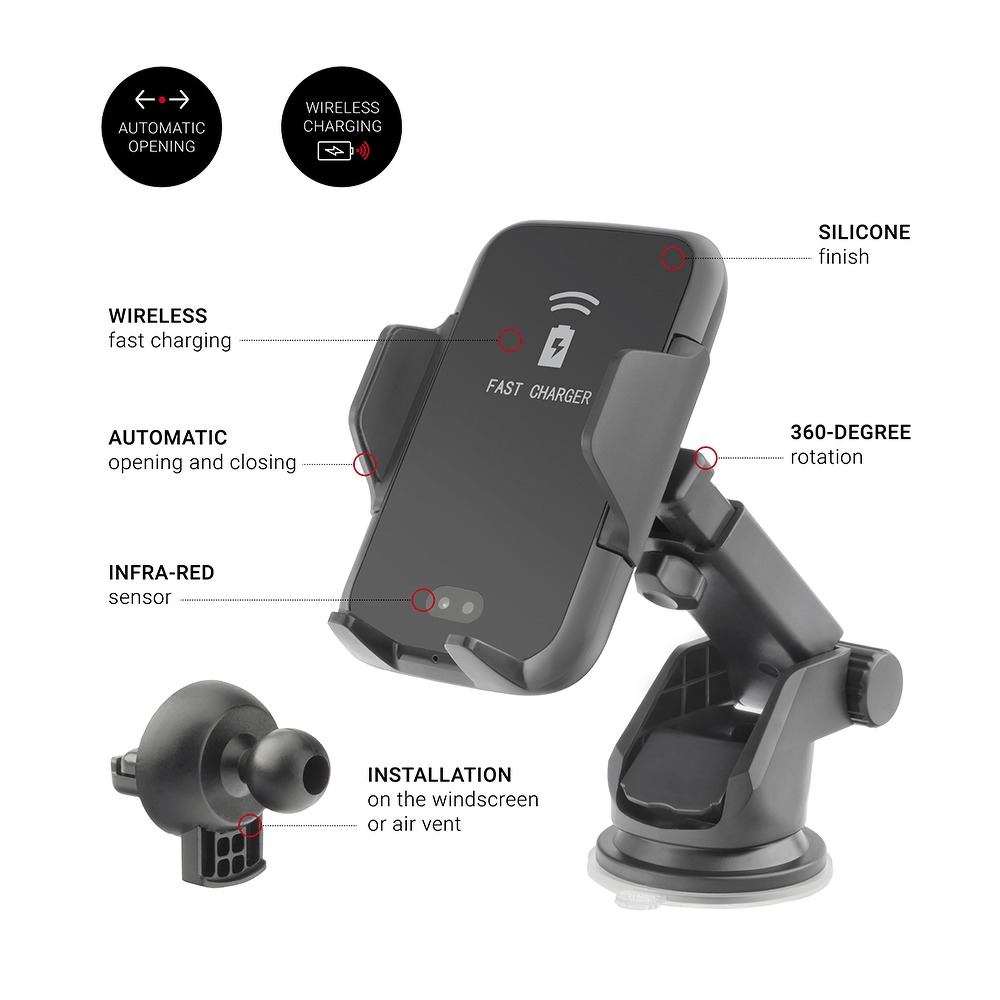Wielofunkcyjny automatyczny uchwyt samochodowy z czujnikiem podczerwieni. Po wykryciu ruchu automatycznie otwiera i zamyka ramiona. Umożliwia także bezprzewodowe ładowanie.